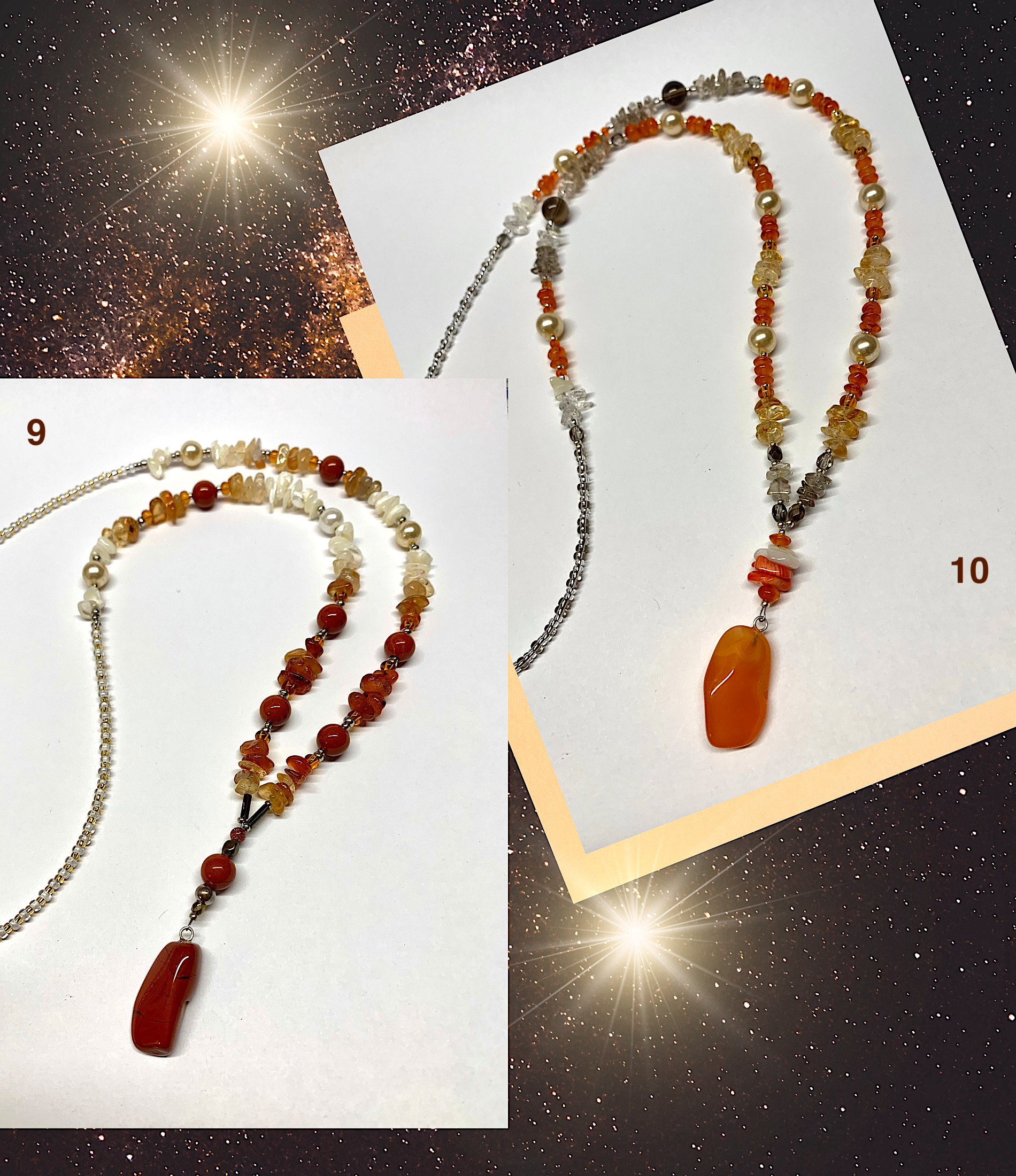 10 - Drobné oranžové korálky karneolu navrací k mladé dospívající Pink, k dívce, která zraje v ženu. Vše, co tam zapomněla, nevyjádřila a potlačila jí připomíná, že může vzkřísit, že hravost a lehkost existuje. Navrací kreativní část tvojí čisté zářivé energie a podporuje v ji jako jiskření ohně v úžasu nad tím, co vše je možné. Ano i pro tebe. Víra a Důvěra.