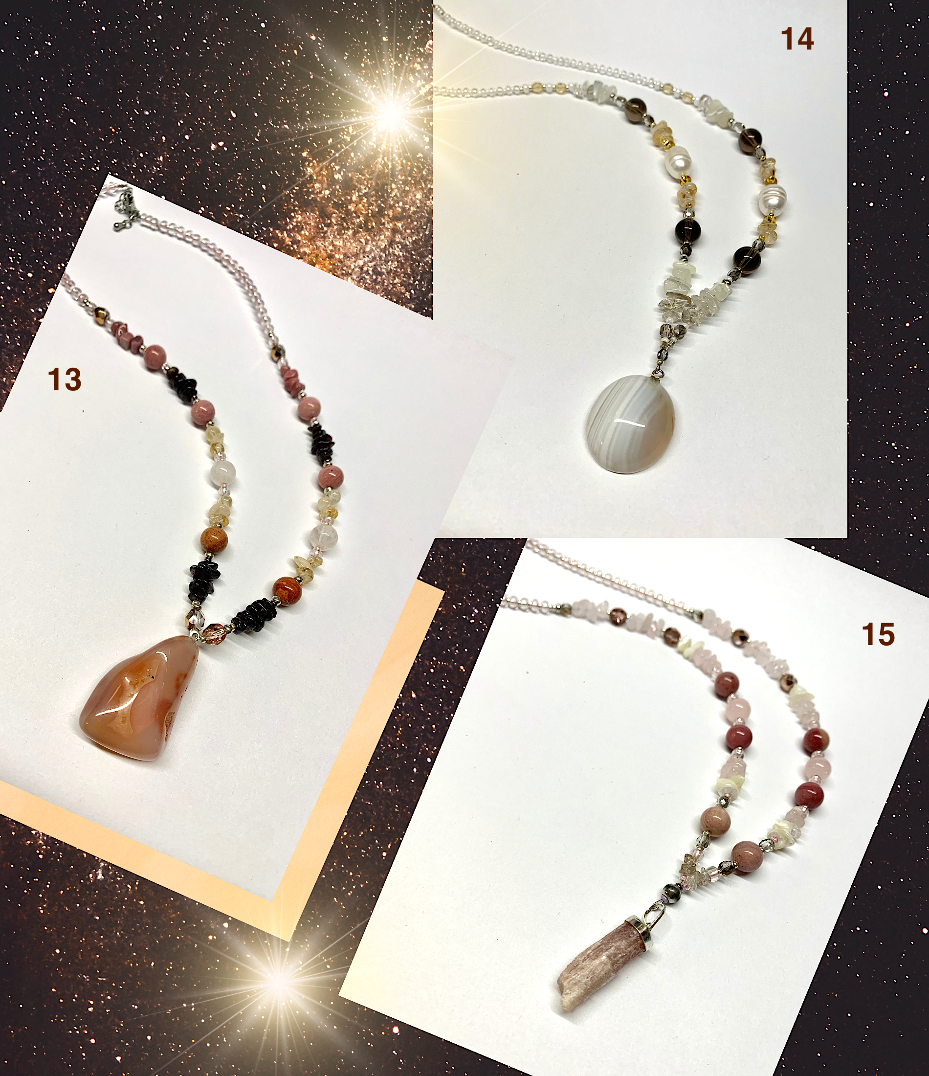 14 - Achátový závěs, citrín, perly, záhněda. Kombinace na probuzení vyšší duchovní roviny. Podpora citlivosti a darů proniknout do podstaty věcí na hlubší porozumění. Navrací "slunce" do srdce a víru v hojnost a dobré konce. Věřím a důvěřuji.